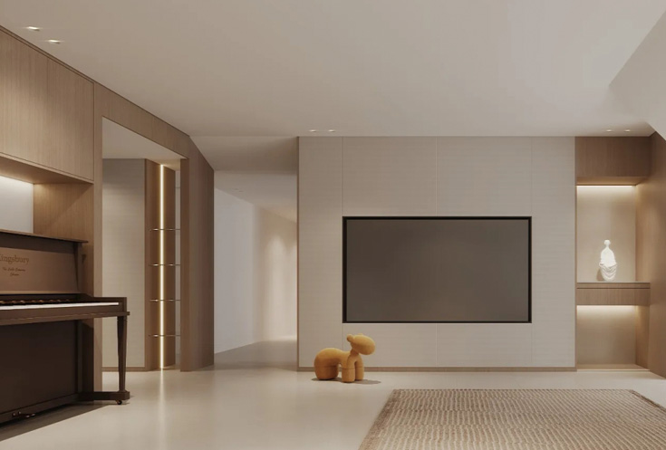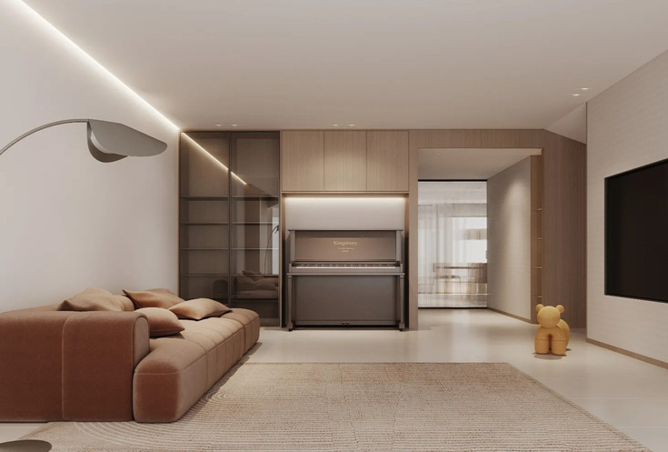 对居住环境的思考,在满足功能需求的基础上,能够使居住者与空间之间产生情绪及情感的互动交流,通过设计为日常生活注入诗一般的美感。回到家中能够通过轻松自然的生活氛围感受到精神的愉悦与自由。建筑学上为人熟知的风格,引用到室内设计中,会是一种相对少见的装修风格,但其独特风格同样优雅地传递着,家居对时间的理解,对岁月的尊重。
